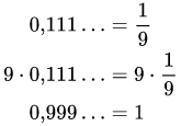 Reelle Zahlen werden in den Erstsemestervorlesungen meist auf ziemlich abstrakte Weise eingeführt, typischerweise als Dedekind-Schnitte. Näher an der Intuition und an der Schulmathematik fand ich es immer, reelle Zahlen als Dezimalbrüche einzuführen. Das Problem mit diesem Ansatz ist natürlich, dass unterschiedliche Dezimalbrüche dieselbe Zahl darstellen können: 0,999… ist dasselbe wie 1,000…, und genauso ist dann…