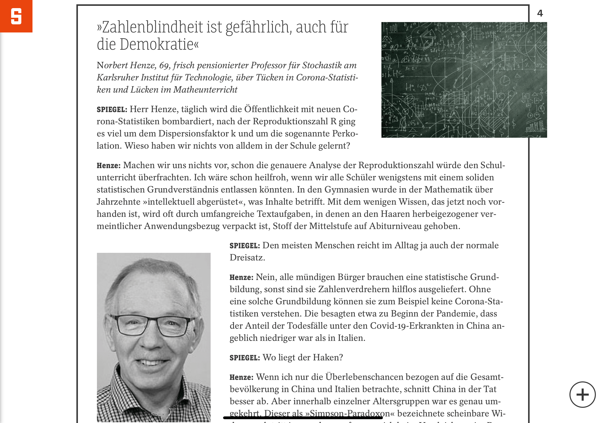 Norbert Henze vom Karlsruher Institut für Technologie (Autor mehrerer Lehrbücher für Einsteiger) fordert im Interview mit dem SPIEGEL eine solide Statistik-Grundausbildung für alle Lehramtsstudenten. SPIEGEL: Herr Henze, täglich wird die Öffentlichkeit mit neuen Corona-Statistiken bombardiert, nach der Reproduktionszahl R ging es viel um dem Dispersionsfaktor k und um die sogenannte Perkolation. Wieso haben wir nichts…