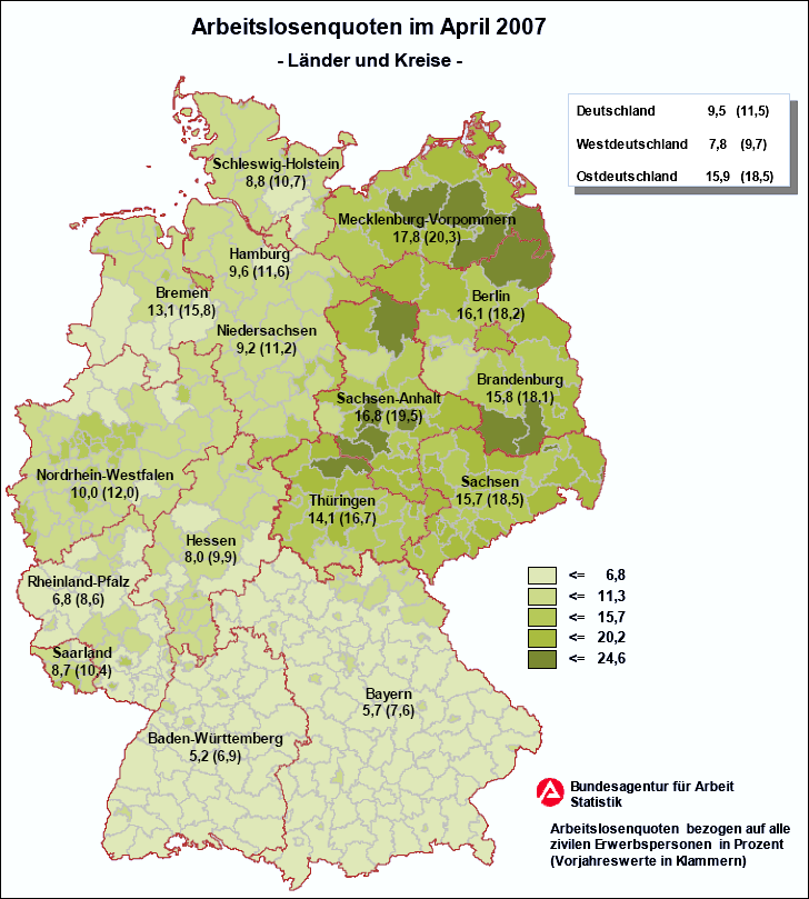Zumindest der “signifikante” Zusammenhang zwischen Suizid und Arbeitslosigkeit ist nach der Statistik 2007 nicht gegeben, wie dieses und dieses Bild im Vergleich zeigt. Eher muss man davon ausgehen, dass in Regionen mit geringer Arbeitslosigkeit die Suizidrate höher ist, was wohl keinen logischen Zusammenhang haben dürfte. Inwieweit erfasste Suizidversuche die Statistik beeinflussen ist auch nicht ganz klar. Aber immerhin gibt man einen Hinweis darauf, dass die Suizidrate auch von der Häufigkeit des Singledaseins in der Gesellschaft abhängen könnte. Vielleicht gibt es ja in BY und BW mehr Singles als vermutet, aber dazu habe ich nichts gefunden.