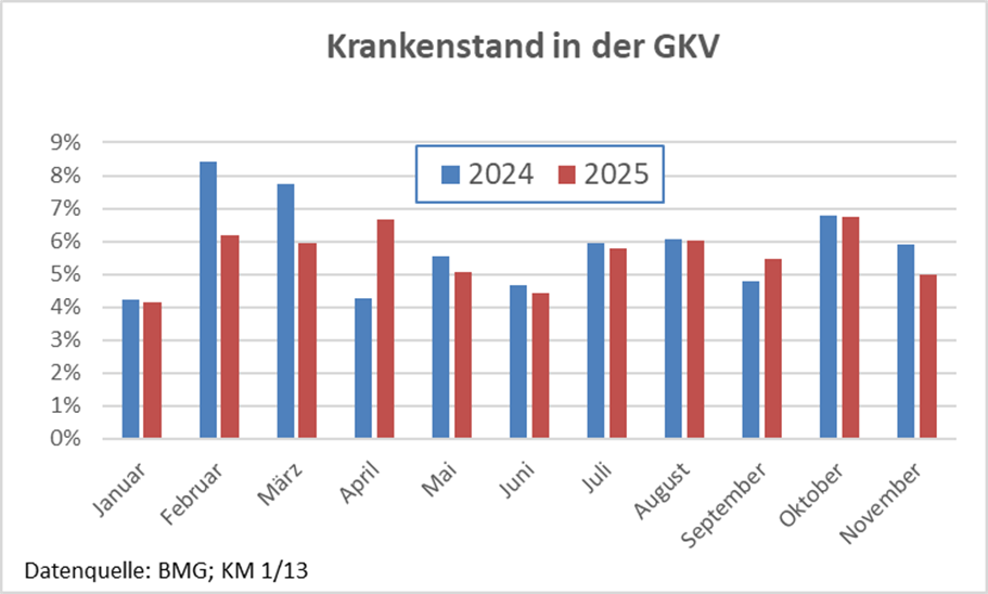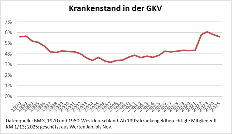 Was die Höhe des Krankenstands angeht, so ist er in Deutschland seit 2022 verglichen mit den Vorjahren recht hoch. Es gibt unterschiedliche Erfassungsweisen und Datenquellen. Nimmt man die Daten des Bundesgesundheitsministeriums aus der KM 1/13-Statistik auf Basis der GKV-Meldungen, lag der Krankenstand 2024 bei 5,8 % und er könnte 2025, die Monatswerte Januar bis November zugrunde gelegt, bei 5,6 % liegen. Den höchsten Wert hatte er 2023 mit 6,07 %.