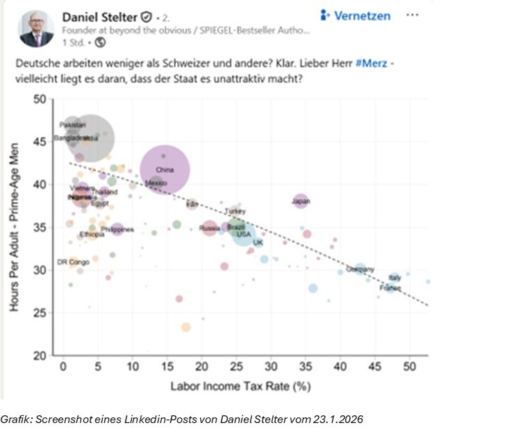 Eine dritte Frage wäre, ob der von Stelter insinuierte Zusammenhang angesichts interpersoneller Varianzen überhaupt sinnvoll auf der Ebene von durchschnittlichen Arbeitszeiten und durchschnittlichen Steuersätzen abzubilden ist, und falls ja, wie valide diese Daten z.B. in Äthiopien oder im Kongo ermittelt wurden.