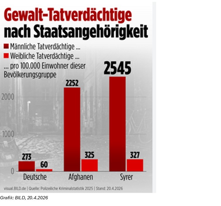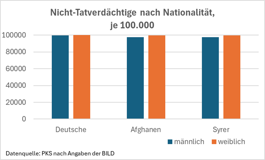 Man könnte zu diesen Zahlen viel anmerken, z.B. was den Unterschied zwischen Tatverdächtigen und Verurteilten angeht, was die Art der Tatvorwürfe angeht, was die Wahrscheinlichkeit unterschiedlicher ethnischer Gruppen angeht, angezeigt zu werden, gerade wenn manche unter Generalverdacht gestellt werden, warum ausgerechnet Afghanen und Syrer dargestellt werden und nicht etwa Russlanddeutsche oder Rumänen, wie es je nach Aufenthaltsstatus der Afghanen und Syrer aussieht, oder was den Sinn eines Vergleichs dieser Gruppen ohne Alters- und Geschlechtsstandardisierung angeht. Die Grafik hat etwas vom Vergleich der Demenzraten in Grundschulen und Pflegeheimen.
