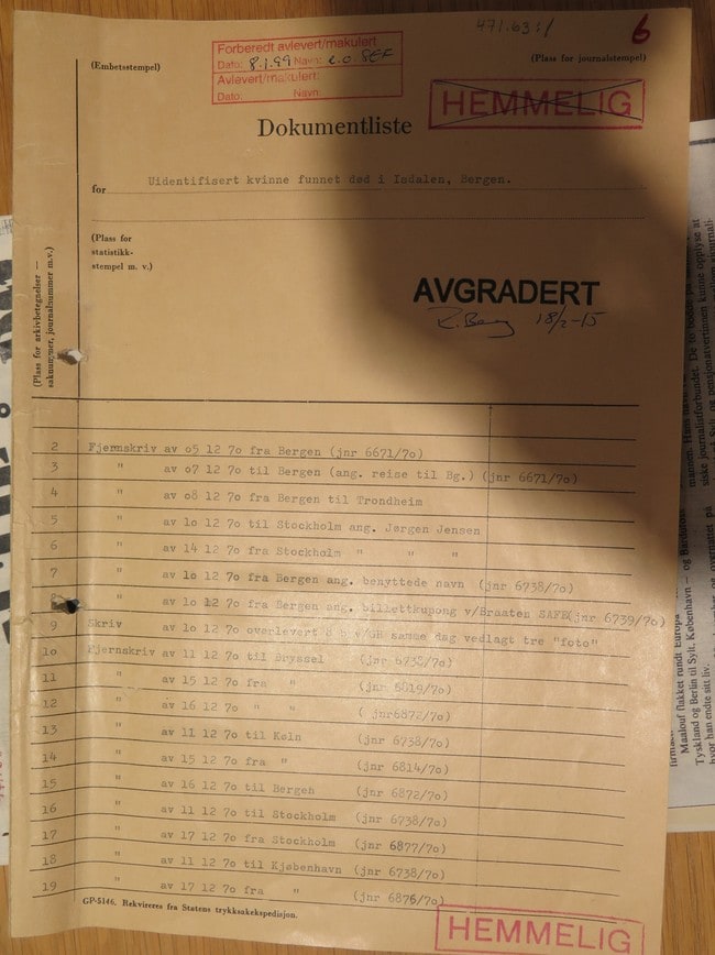 Das heißt wohl (leider kann ich kein Norwegisch, vielleicht kann ein Leser den Absatz übersetzen), dass B für Bergen, S für Stavanger, O für Oslo, L für London, R für Rom und P für Paris steht. M steht für März, AL für April. Anscheinend war die Isal-Frau am 20. März in Oslo angekommen und hielt sich vom 24. bis 31. März in Bergen auf. Vom 11.-16. März war sie in London und danach bis zum 19. März in Genf. Ein Abgleich mit den Daten von Fluggesellschaften ergab, dass eine Frau namens Genevieve Lancier dazu passende Flugreisen unternommen hatte. Dies war wohl einer der Falschnamen, die die Dame verwendete.