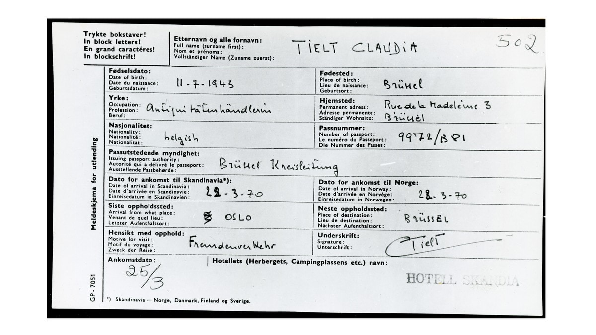 “Eksperten antok at B var for Bergen, S Stavanger; O Oslo, L London, R Roma, P Paris, M sto for mars, AL for april osv. MM, JJ og ML var til a begynne med uforstaelig. En kontroll av fremmedskjemaer og flyselskapenes lister mot notatene 20 M 23 M merket med O, viste seg å føre til en Genevieve Lancier som var ankommet Oslo med fly fra Geneve allerede 20. mars og oppholdt seg i Bergen 24.-31. mars. De to linjene foran tydet på at hun var i London 11.-16. mars og i Genéve 16.-19. mars før hun dro til Oslo.”