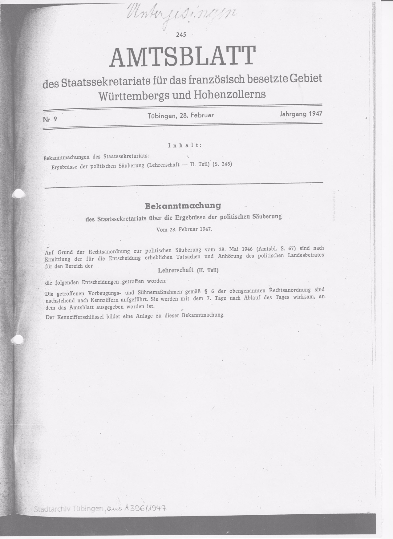 Nachtrag (April 2017) Prof. Jörg Stark aus Kusterdingen, Autor der oben zitierten Festschrift, hat mir folgende Dokumente zukommen lassen, aus denen hervorgeht dass tatsächlich Fladt und nicht Schweizer nach Kriegsende zunächst nicht wieder Schuldirektor werden durfte.