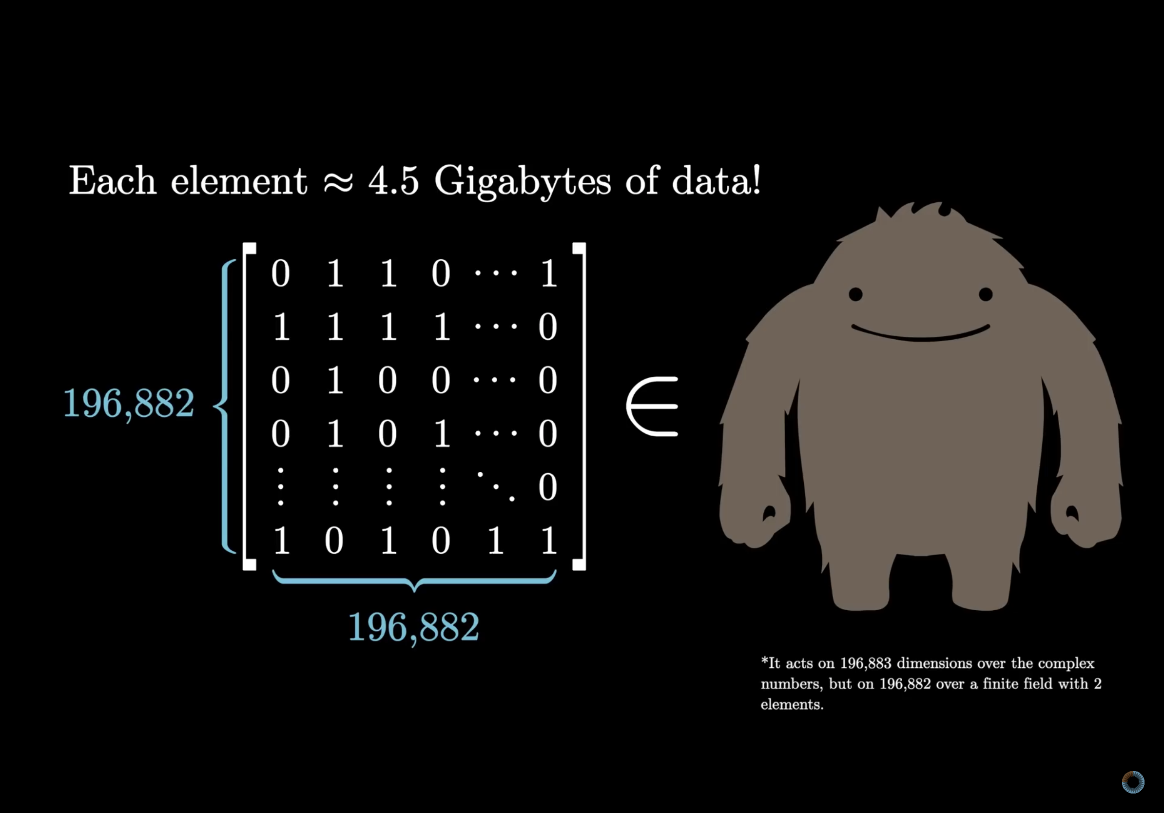 3Blue1Brown hat ein neues Video Group Theory and why I love 808,017,424,794,512,875,886,459,904,961,710,757,005,754,368,000,000,000 (unter Mithilfe von Richard Borcherds). Es geht um Gruppen und wo sie überall vorkommen in Algebra, Geometrie, Physik, um die Klassifikation endlicher Gruppen und schließlich um die Monster-Gruppe und die Mondschein-Vermutung.