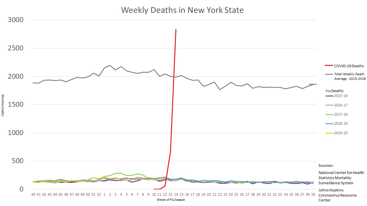 Die graue Linie zeigt die wöchentlichen Sterbefälle im New York der letzten fünf Jahre, die fünf bunten Linien zeigen für jedes der letzten fünf Jahre die wöchentlichen Grippetoten. (Eine Häufung scheint es im Januar/Februar 2018 gegeben zu haben.) Die rote Linie zeigt die wöchentlichen Corona-Toten in 2020. Und ja, natürlich sollte man nicht einfach suggestiven…