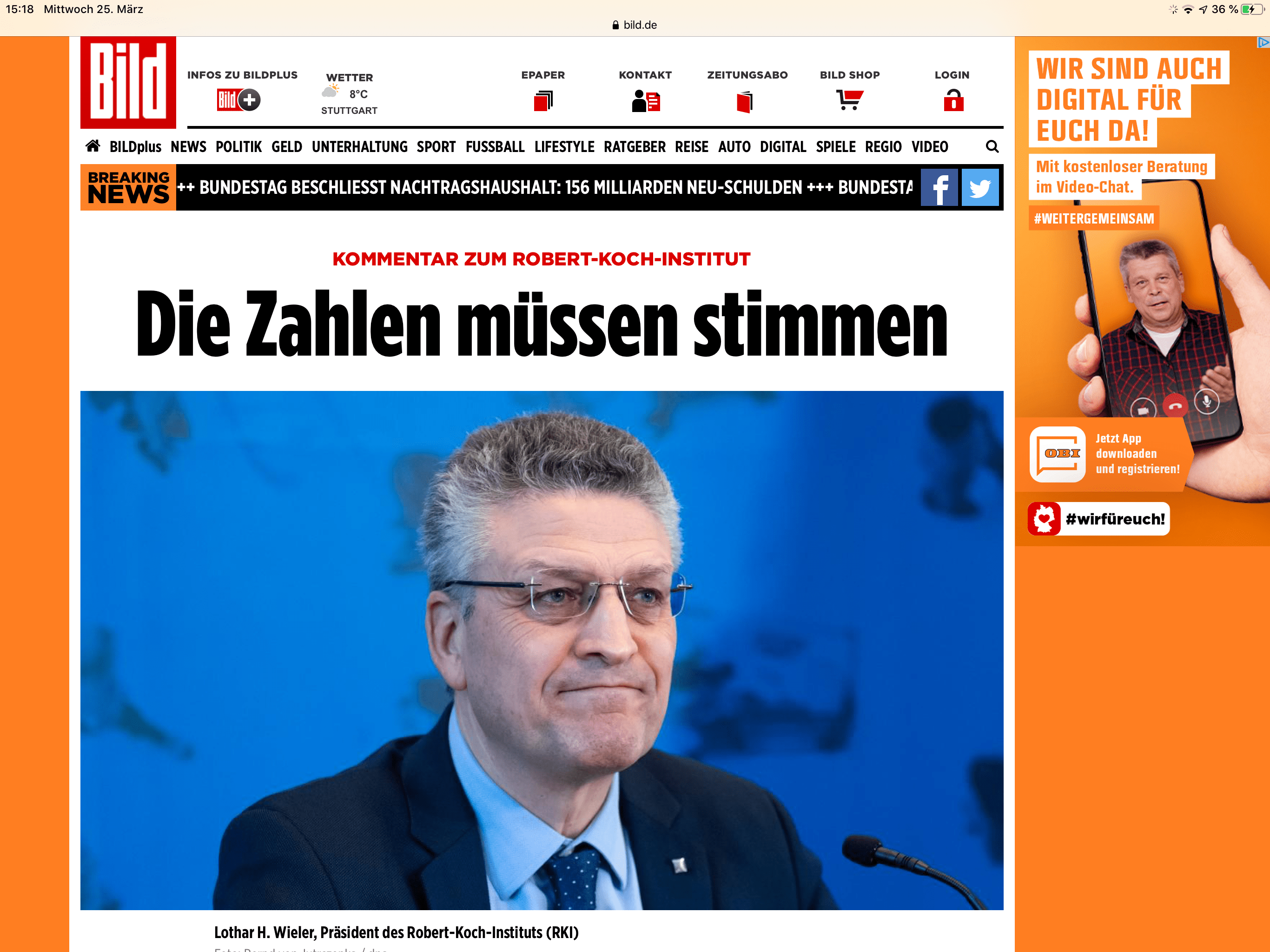 Die BILD-Zeitung beklagt sich in einem Kommentar über die Zahlen des Robert-Koch-Instituts: Auf Basis dieser Zahlen und Daten haben wir die schärfsten Freiheits-Einschränkungen seit Bestehen der Bundesrepublik beschlossen. Sie müssen stimmen! Die Experten müssen uns erklären, wie ihre Statistiken zustande kommen. Wie sie entscheiden, ob ein Infizierter wirklich an Corona gestorben ist. Für die Abweichungen…