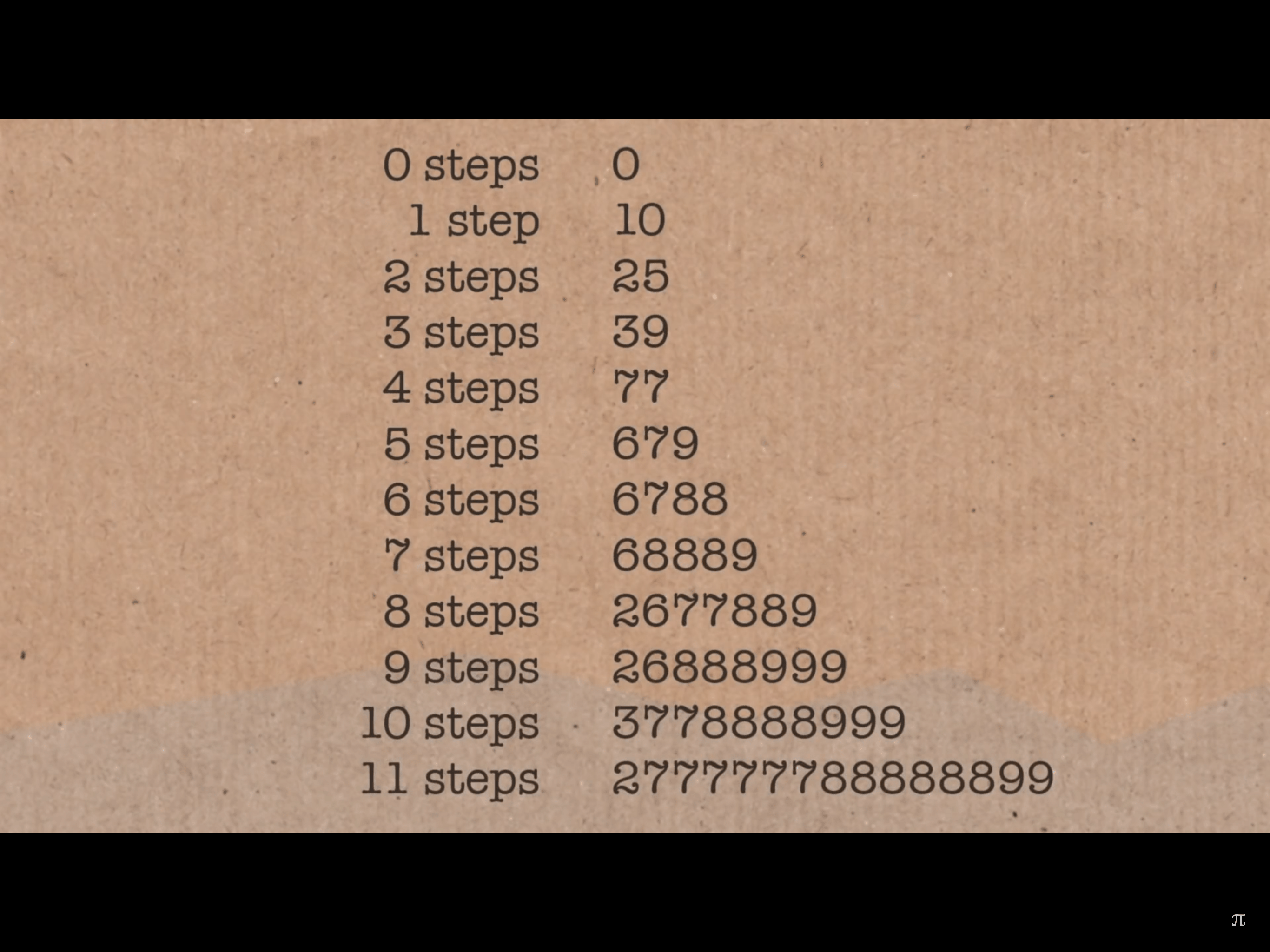 Nimm eine große Zahl und multipliziere ihre Ziffern. Nimm das Ergebnis und multipliziere seine Ziffern. Und so weiter. Wenn in der Ausgangszahl eine Null vorkam, bekommt man natürlich schon im ersten Schritt Null als Ergebnis. Wenn nicht, wird man bei einer großen Zahl mit einer recht großen Wahrscheinlichkeit eine Ziffer Null im Produkt und demzufolge…