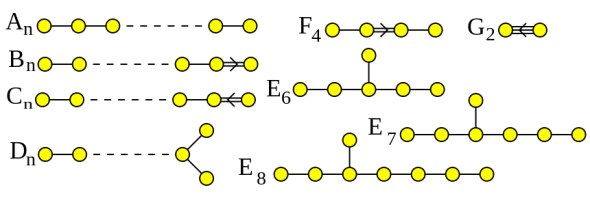 Dynkin-Diagramme sind sicher eines der überzeugendsten Beispiele für die Universalität der Mathematik, dass dieselben Strukturen überall vorkommen. Sie klassifizieren die in der Elementarteilchenphysik vorkommenden (1913 von Cartan klassifizierten) einfachen Lie-Gruppen ebenso wie die (1935 von Coxeter klassifizierten) endlichen Spiegelungsgruppen in der euklidischen Geometrie oder nach V.I.Arnold die Elementarkatastrophen in der (auch als Katastrophentheorie bezeichneten) Theorie…