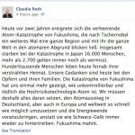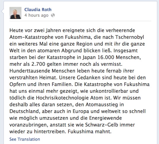 Die HanoverGEN-Posse der frisch gewählten rot-grünen Regierung in Niedersachsen ist noch nicht richtig vom Tisch, da legt die fast so frisch wieder gewählte Parteivorsitzende der GRÜNEN nach. Claudia Roth verbreitete heute auf ihrem Facebookprofil mahnende Worte zu Fukushima – und macht aus einer Naturkatastrophe eine Atomkatastrophe: Heute vor zwei Jahren ereignete sich die verheerende Atom-Katastrophe…
